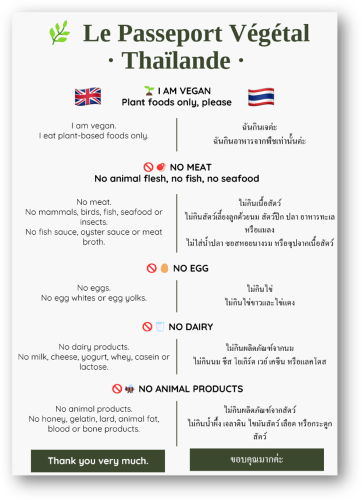 Les phrases essentielles traduites dans la langue du pays (sans viande, sans poisson, sans œuf, sans lait…) pour voyager plus sereinement, fidèle à vos choix.
